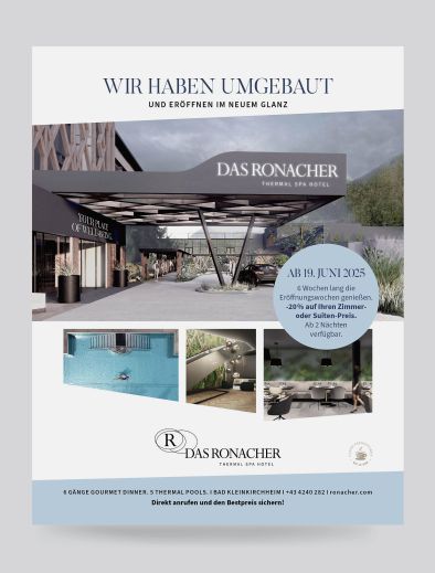 DAS Ronacher startet eine mehrjährige Transformation. Schritt für Schritt entsteht ein neues Resort, das Tradition respektiert und zugleich mutig in die Zukunft geht. Der erste Bauabschnitt setzt ein starkes Zeichen: ein erneuerter Eingangsbereich, eine neue Rezeption und ein neues Entree zum Restaurant. Modern, offen, warm. Ein Auftakt, der Lust auf mehr macht.